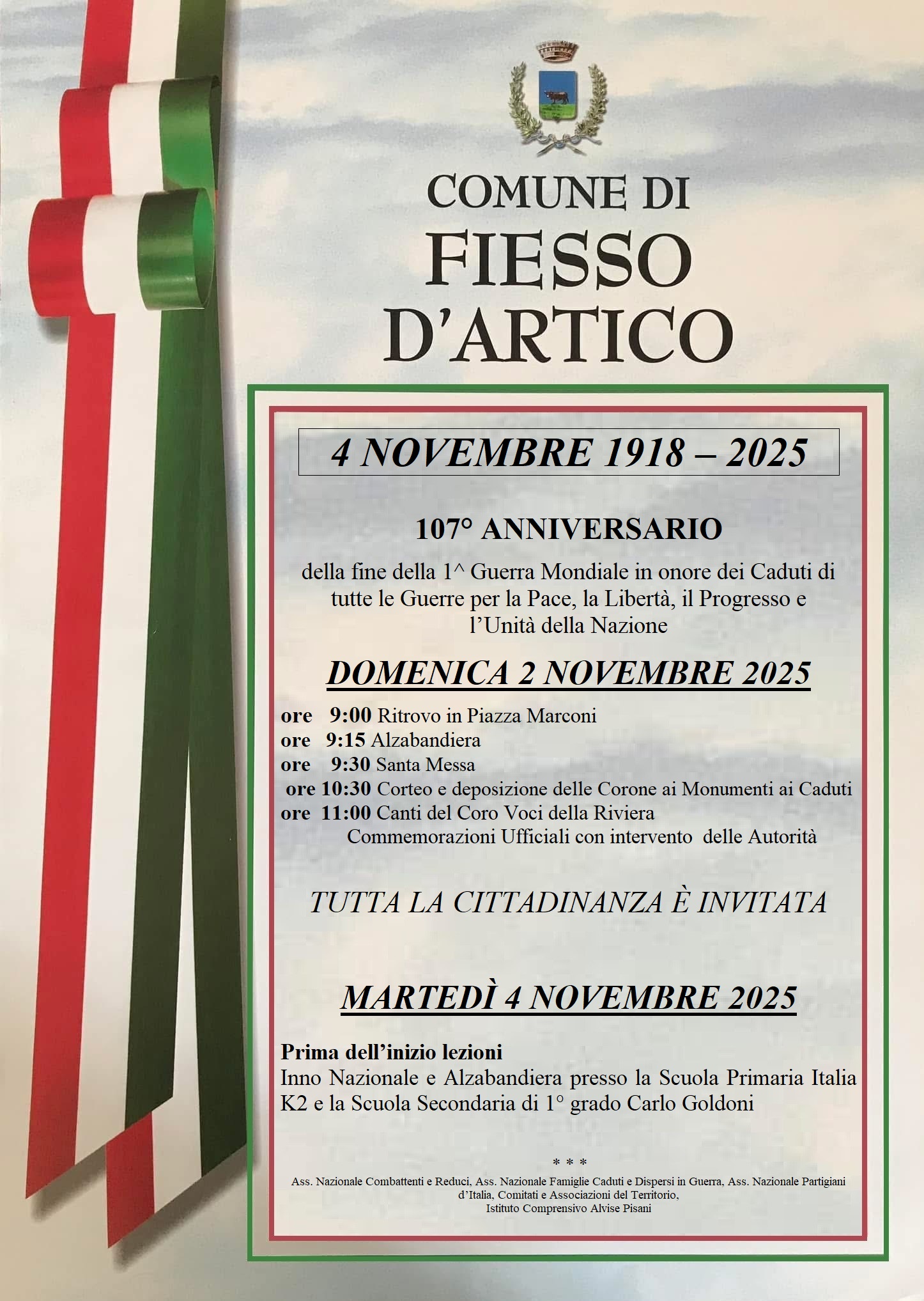 Il Comune di Fiesso d’Artico, in collaborazione con l’associazionismo locale, celebra nella mattinata di domenica 2 novembre la Solennità Civile del 4 Novembre, 107° Anniversario della fine della Prima Guerra Mondiale, in onore dei Caduti di tutte le Guerre per la Pace, la Libertà, il Progresso e l’Unità della Nazione.