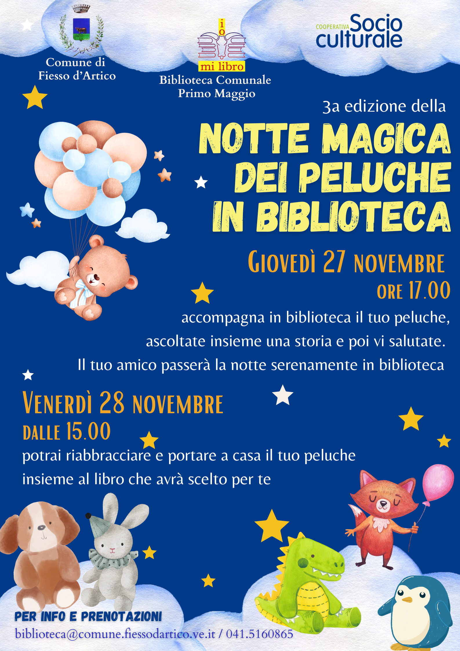 È prevista per Giovedì 27 Novembre alle ore 17:00 una Lettura animata in biblioteca per bimbi, bimbe con loro peluche, alla fine della quale i peluche saranno lasciati in biblioteca dove, la notte, prenderanno magicamente vita per scegliere un libro per il/la loro compagno/a di avventure.
